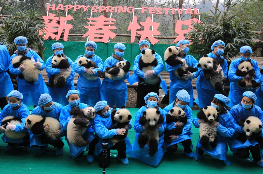 At Chengdu Panda Breeding Research Centre, keepers videoed a Welcome Chinese New Year routine with 23 baby pandas.